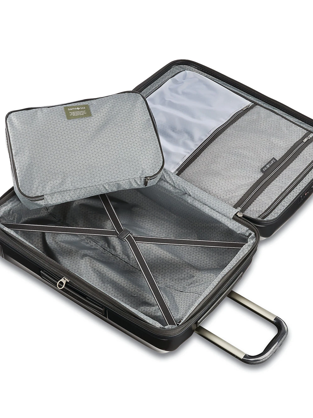 - Interior: Cubed3™ Packing System snaps in place keeping items neat, WetPak™ pocket keeps liquids contained, mesh pocket and elastic tie-down straps add organization